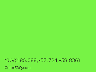 YUV 186.088,-57.724,-58.836 Color is a light green color and the nearest color is Kiwi #8ee53f. Hex code #77f345 and RGB value is rgb(119,243,69). In RGB color space, this color is composed of 47% red, 95% green, 27% blue, In CMYK color space, this color is composed of 51% cyan, 0% magenta, 72% yellow , 5% black , In HSL color space, this color has a hue angle of 103° , 88% saturation and 61% lightness.