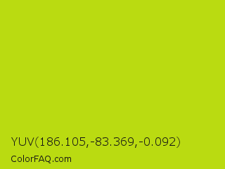 YUV 186.105,-83.369,-0.092 Color is a normal yellow color and the nearest color is Fuego #bede0d. Hex code #badb11 and RGB value is rgb(186,219,17). In RGB color space, this color is composed of 73% red, 86% green, 7% blue, In CMYK color space, this color is composed of 15% cyan, 0% magenta, 92% yellow , 14% black , In HSL color space, this color has a hue angle of 70° , 86% saturation and 46% lightness.