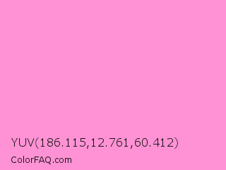 YUV 186.115,12.761,60.412 Color is a light magenta color and the nearest color is Pale Magenta Pink #ff99cc. Hex code #ff92d4 and RGB value is rgb(255,146,212). In RGB color space, this color is composed of 100% red, 57% green, 83% blue, In CMYK color space, this color is composed of 0% cyan, 43% magenta, 17% yellow , 0% black , In HSL color space, this color has a hue angle of 324° , 100% saturation and 79% lightness.