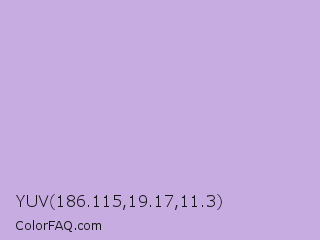 YUV 186.115,19.17,11.3 Color is a light purple color and the nearest color is Tropical Violet #cda4de. Hex code #c7ace1 and RGB value is rgb(199,172,225). In RGB color space, this color is composed of 78% red, 67% green, 88% blue, In CMYK color space, this color is composed of 12% cyan, 24% magenta, 0% yellow , 12% black , In HSL color space, this color has a hue angle of 271° , 47% saturation and 78% lightness.