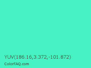 YUV 186.16,3.372,-101.872 Color is a light green color and the nearest color is Turquoise #40e0d0. Hex code #46f4c1 and RGB value is rgb(70,244,193). In RGB color space, this color is composed of 27% red, 96% green, 76% blue, In CMYK color space, this color is composed of 71% cyan, 0% magenta, 21% yellow , 4% black , In HSL color space, this color has a hue angle of 162° , 89% saturation and 62% lightness.