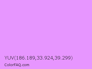 YUV 186.189,33.924,39.299 Color is a light purple color and the nearest color is Rich Brilliant Lavender #f1a7fe. Hex code #e796ff and RGB value is rgb(231,150,255). In RGB color space, this color is composed of 91% red, 59% green, 100% blue, In CMYK color space, this color is composed of 9% cyan, 41% magenta, 0% yellow , 0% black , In HSL color space, this color has a hue angle of 286° , 100% saturation and 79% lightness.
