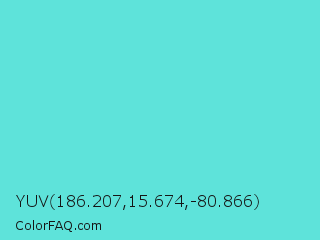 YUV 186.207,15.674,-80.866 Color is a light cyan color and the nearest color is Turquoise Blue #6cdae7. Hex code #5ee3da and RGB value is rgb(94,227,218). In RGB color space, this color is composed of 37% red, 89% green, 85% blue, In CMYK color space, this color is composed of 59% cyan, 0% magenta, 4% yellow , 11% black , In HSL color space, this color has a hue angle of 176° , 70% saturation and 63% lightness.