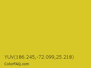 YUV 186.245,-72.099,25.218 Color is a normal yellow color and the nearest color is Sunflower #e4d422. Hex code #d7c828 and RGB value is rgb(215,200,40). In RGB color space, this color is composed of 84% red, 78% green, 16% blue, In CMYK color space, this color is composed of 0% cyan, 7% magenta, 81% yellow , 16% black , In HSL color space, this color has a hue angle of 55° , 69% saturation and 50% lightness.