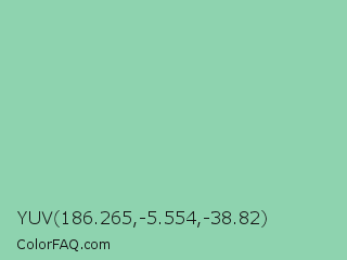 YUV 186.265,-5.554,-38.82 Color is a light green color and the nearest color is Vista Blue #8fd6b4. Hex code #8ed3af and RGB value is rgb(142,211,175). In RGB color space, this color is composed of 56% red, 83% green, 69% blue, In CMYK color space, this color is composed of 33% cyan, 0% magenta, 17% yellow , 17% black , In HSL color space, this color has a hue angle of 149° , 44% saturation and 69% lightness.