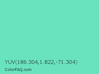 YUV 186.304,1.822,-71.304 Color is a light green color and the nearest color is Medium Aquamarine #66ddaa. Hex code #69e3be and RGB value is rgb(105,227,190). In RGB color space, this color is composed of 41% red, 89% green, 75% blue, In CMYK color space, this color is composed of 54% cyan, 0% magenta, 16% yellow , 11% black , In HSL color space, this color has a hue angle of 162° , 69% saturation and 65% lightness.
