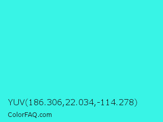 YUV 186.306,22.034,-114.278 Color is a normal cyan color and the nearest color is Turquoise #40e0d0. Hex code #38f4e7 and RGB value is rgb(56,244,231). In RGB color space, this color is composed of 22% red, 96% green, 91% blue, In CMYK color space, this color is composed of 77% cyan, 0% magenta, 5% yellow , 4% black , In HSL color space, this color has a hue angle of 176° , 90% saturation and 59% lightness.
