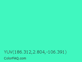 YUV 186.312,2.804,-106.391 Color is a light green color and the nearest color is Turquoise #40e0d0. Hex code #41f7c0 and RGB value is rgb(65,247,192). In RGB color space, this color is composed of 25% red, 97% green, 75% blue, In CMYK color space, this color is composed of 74% cyan, 0% magenta, 22% yellow , 3% black , In HSL color space, this color has a hue angle of 162° , 92% saturation and 61% lightness.