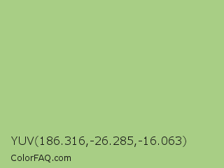 YUV 186.316,-26.285,-16.063 Color is a light green color and the nearest color is Feijoa #9fdd8c. Hex code #a8ce85 and RGB value is rgb(168,206,133). In RGB color space, this color is composed of 66% red, 81% green, 52% blue, In CMYK color space, this color is composed of 18% cyan, 0% magenta, 35% yellow , 19% black , In HSL color space, this color has a hue angle of 91° , 43% saturation and 66% lightness.