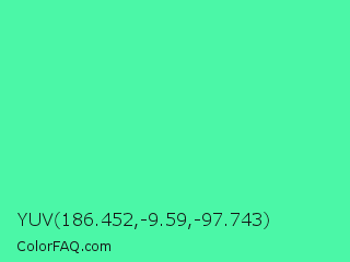 YUV 186.452,-9.59,-97.743 Color is a light green color and the nearest color is Eucalyptus #44d7a8. Hex code #4bf7a7 and RGB value is rgb(75,247,167). In RGB color space, this color is composed of 29% red, 97% green, 65% blue, In CMYK color space, this color is composed of 70% cyan, 0% magenta, 32% yellow , 3% black , In HSL color space, this color has a hue angle of 152° , 91% saturation and 63% lightness.