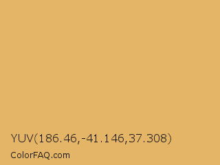 YUV 186.46,-41.146,37.308 Color is a light orange color and the nearest color is Equator #e1bc64. Hex code #e5b567 and RGB value is rgb(229,181,103). In RGB color space, this color is composed of 90% red, 71% green, 40% blue, In CMYK color space, this color is composed of 0% cyan, 21% magenta, 55% yellow , 10% black , In HSL color space, this color has a hue angle of 37° , 71% saturation and 65% lightness.
