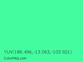 YUV 186.496,-13.063,-103.921 Color is a light green color and the nearest color is Eucalyptus #44d7a8. Hex code #44fca0 and RGB value is rgb(68,252,160). In RGB color space, this color is composed of 27% red, 99% green, 63% blue, In CMYK color space, this color is composed of 73% cyan, 0% magenta, 37% yellow , 1% black , In HSL color space, this color has a hue angle of 150° , 97% saturation and 63% lightness.