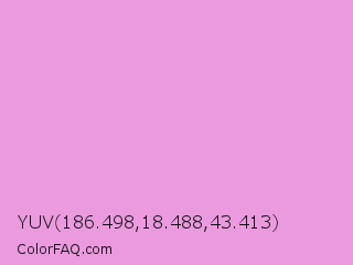 YUV 186.498,18.488,43.413 Color is a light magenta color and the nearest color is Medium Lavender Magenta #dda0dd. Hex code #ec9ae0 and RGB value is rgb(236,154,224). In RGB color space, this color is composed of 93% red, 60% green, 88% blue, In CMYK color space, this color is composed of 0% cyan, 35% magenta, 5% yellow , 7% black , In HSL color space, this color has a hue angle of 309° , 68% saturation and 76% lightness.
