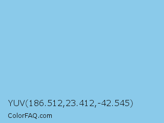 YUV 186.512,23.412,-42.545 Color is a light blue color and the nearest color is Sky Blue #87ceeb. Hex code #8acaea and RGB value is rgb(138,202,234). In RGB color space, this color is composed of 54% red, 79% green, 92% blue, In CMYK color space, this color is composed of 41% cyan, 14% magenta, 0% yellow , 8% black , In HSL color space, this color has a hue angle of 200° , 70% saturation and 73% lightness.