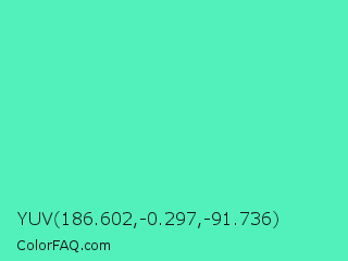 YUV 186.602,-0.297,-91.736 Color is a light green color and the nearest color is Medium Aquamarine #66ddaa. Hex code #52f0ba and RGB value is rgb(82,240,186). In RGB color space, this color is composed of 32% red, 94% green, 73% blue, In CMYK color space, this color is composed of 66% cyan, 0% magenta, 23% yellow , 6% black , In HSL color space, this color has a hue angle of 159° , 84% saturation and 63% lightness.