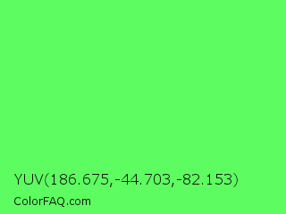 YUV 186.675,-44.703,-82.153 Color is a light green color and the nearest color is Screamin Green #66ff66. Hex code #5dfc60 and RGB value is rgb(93,252,96). In RGB color space, this color is composed of 36% red, 99% green, 38% blue, In CMYK color space, this color is composed of 63% cyan, 0% magenta, 62% yellow , 1% black , In HSL color space, this color has a hue angle of 121° , 96% saturation and 68% lightness.