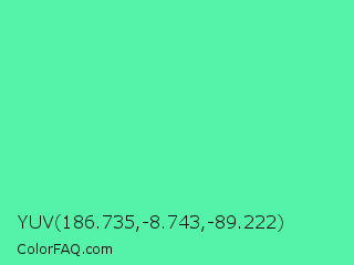 YUV 186.735,-8.743,-89.222 Color is a light green color and the nearest color is Medium Aquamarine #66ddaa. Hex code #55f2a9 and RGB value is rgb(85,242,169). In RGB color space, this color is composed of 33% red, 95% green, 66% blue, In CMYK color space, this color is composed of 65% cyan, 0% magenta, 30% yellow , 5% black , In HSL color space, this color has a hue angle of 152° , 86% saturation and 64% lightness.