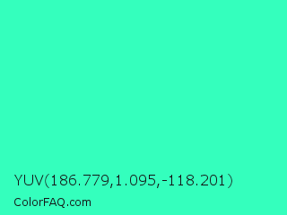 YUV 186.779,1.095,-118.201 Color is a normal green color and the nearest color is Turquoise #40e0d0. Hex code #34ffbd and RGB value is rgb(52,255,189). In RGB color space, this color is composed of 20% red, 100% green, 74% blue, In CMYK color space, this color is composed of 80% cyan, 0% magenta, 26% yellow , 0% black , In HSL color space, this color has a hue angle of 160° , 100% saturation and 60% lightness.