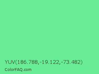 YUV 186.788,-19.122,-73.482 Color is a light green color and the nearest color is Very Light Malachite Green #64e986. Hex code #67ed94 and RGB value is rgb(103,237,148). In RGB color space, this color is composed of 40% red, 93% green, 58% blue, In CMYK color space, this color is composed of 57% cyan, 0% magenta, 38% yellow , 7% black , In HSL color space, this color has a hue angle of 140° , 79% saturation and 67% lightness.