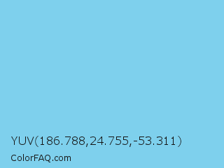 YUV 186.788,24.755,-53.311 Color is a light blue color and the nearest color is Seagull #80ccea. Hex code #7ed0ed and RGB value is rgb(126,208,237). In RGB color space, this color is composed of 49% red, 82% green, 93% blue, In CMYK color space, this color is composed of 47% cyan, 12% magenta, 0% yellow , 7% black , In HSL color space, this color has a hue angle of 196° , 76% saturation and 71% lightness.
