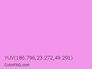 YUV 186.796,23.272,49.291 Color is a light magenta color and the nearest color is Lavender Rose #fba0e3. Hex code #f395ea and RGB value is rgb(243,149,234). In RGB color space, this color is composed of 95% red, 58% green, 92% blue, In CMYK color space, this color is composed of 0% cyan, 39% magenta, 4% yellow , 5% black , In HSL color space, this color has a hue angle of 306° , 80% saturation and 77% lightness.