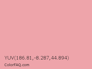 YUV 186.81,-8.287,44.894 Color is a light red color and the nearest color is Wewak #f19bab. Hex code #eea4aa and RGB value is rgb(238,164,170). In RGB color space, this color is composed of 93% red, 64% green, 67% blue, In CMYK color space, this color is composed of 0% cyan, 31% magenta, 29% yellow , 7% black , In HSL color space, this color has a hue angle of 355° , 69% saturation and 79% lightness.