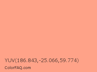 YUV 186.843,-25.066,59.774 Color is a light red color and the nearest color is Vivid Tangerine #ffa089. Hex code #ffa288 and RGB value is rgb(255,162,136). In RGB color space, this color is composed of 100% red, 64% green, 53% blue, In CMYK color space, this color is composed of 0% cyan, 36% magenta, 47% yellow , 0% black , In HSL color space, this color has a hue angle of 13° , 100% saturation and 77% lightness.