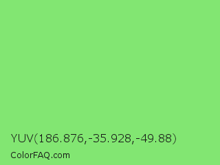 YUV 186.876,-35.928,-49.88 Color is a light green color and the nearest color is Pastel Green #77dd77. Hex code #82e672 and RGB value is rgb(130,230,114). In RGB color space, this color is composed of 51% red, 90% green, 45% blue, In CMYK color space, this color is composed of 43% cyan, 0% magenta, 50% yellow , 10% black , In HSL color space, this color has a hue angle of 112° , 70% saturation and 67% lightness.