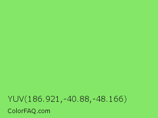 YUV 186.921,-40.88,-48.166 Color is a light green color and the nearest color is Pastel Green #77dd77. Hex code #84e768 and RGB value is rgb(132,231,104). In RGB color space, this color is composed of 52% red, 91% green, 41% blue, In CMYK color space, this color is composed of 43% cyan, 0% magenta, 55% yellow , 9% black , In HSL color space, this color has a hue angle of 107° , 73% saturation and 66% lightness.