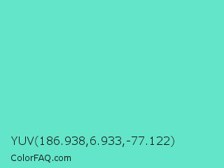 YUV 186.938,6.933,-77.122 Color is a light cyan color and the nearest color is Downy #6fd0c5. Hex code #63e5c9 and RGB value is rgb(99,229,201). In RGB color space, this color is composed of 39% red, 90% green, 79% blue, In CMYK color space, this color is composed of 57% cyan, 0% magenta, 12% yellow , 10% black , In HSL color space, this color has a hue angle of 167° , 71% saturation and 64% lightness.