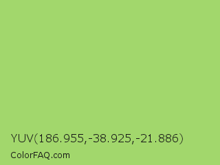 YUV 186.955,-38.925,-21.886 Color is a light green color and the nearest color is Pistachio #93c572. Hex code #a2d76c and RGB value is rgb(162,215,108). In RGB color space, this color is composed of 64% red, 84% green, 42% blue, In CMYK color space, this color is composed of 25% cyan, 0% magenta, 50% yellow , 16% black , In HSL color space, this color has a hue angle of 90° , 57% saturation and 63% lightness.