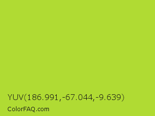 YUV 186.991,-67.044,-9.639 Color is a normal lime color and the nearest color is Android Green #a4c639. Hex code #b0db33 and RGB value is rgb(176,219,51). In RGB color space, this color is composed of 69% red, 86% green, 20% blue, In CMYK color space, this color is composed of 20% cyan, 0% magenta, 77% yellow , 14% black , In HSL color space, this color has a hue angle of 75° , 70% saturation and 53% lightness.