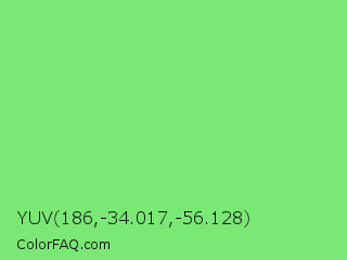 YUV 186,-34.017,-56.128 Color is a light green color and the nearest color is Pastel Green #77dd77. Hex code #7ae875 and RGB value is rgb(122,232,117). In RGB color space, this color is composed of 48% red, 91% green, 46% blue, In CMYK color space, this color is composed of 47% cyan, 0% magenta, 50% yellow , 9% black , In HSL color space, this color has a hue angle of 117° , 71% saturation and 68% lightness.