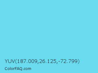 YUV 187.009,26.125,-72.799 Color is a light cyan color and the nearest color is Turquoise Blue #6cdae7. Hex code #68dbf0 and RGB value is rgb(104,219,240). In RGB color space, this color is composed of 41% red, 86% green, 94% blue, In CMYK color space, this color is composed of 57% cyan, 9% magenta, 0% yellow , 6% black , In HSL color space, this color has a hue angle of 189° , 82% saturation and 67% lightness.