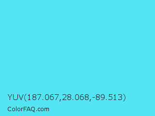 YUV 187.067,28.068,-89.513 Color is a light cyan color and the nearest color is Turquoise Blue #6cdae7. Hex code #55e4f4 and RGB value is rgb(85,228,244). In RGB color space, this color is composed of 33% red, 89% green, 96% blue, In CMYK color space, this color is composed of 65% cyan, 7% magenta, 0% yellow , 4% black , In HSL color space, this color has a hue angle of 186° , 88% saturation and 65% lightness.