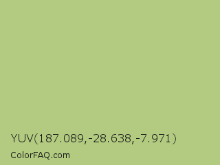 YUV 187.089,-28.638,-7.971 Color is a light green color and the nearest color is Sage #bcb88a. Hex code #b2cb81 and RGB value is rgb(178,203,129). In RGB color space, this color is composed of 70% red, 80% green, 51% blue, In CMYK color space, this color is composed of 12% cyan, 0% magenta, 36% yellow , 20% black , In HSL color space, this color has a hue angle of 80° , 42% saturation and 65% lightness.
