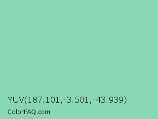 YUV 187.101,-3.501,-43.939 Color is a light green color and the nearest color is Vista Blue #8fd6b4. Hex code #89d6b4 and RGB value is rgb(137,214,180). In RGB color space, this color is composed of 54% red, 84% green, 71% blue, In CMYK color space, this color is composed of 36% cyan, 0% magenta, 16% yellow , 16% black , In HSL color space, this color has a hue angle of 154° , 48% saturation and 69% lightness.