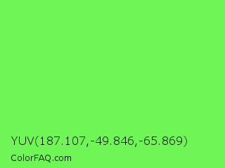 YUV 187.107,-49.846,-65.869 Color is a light green color and the nearest color is Screamin Green #66ff66. Hex code #70f556 and RGB value is rgb(112,245,86). In RGB color space, this color is composed of 44% red, 96% green, 34% blue, In CMYK color space, this color is composed of 54% cyan, 0% magenta, 65% yellow , 4% black , In HSL color space, this color has a hue angle of 110° , 89% saturation and 65% lightness.