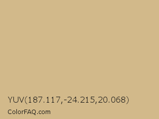 YUV 187.117,-24.215,20.068 Color is a light orange color and the nearest color is Tan #d2b48c. Hex code #d2b98a and RGB value is rgb(210,185,138). In RGB color space, this color is composed of 82% red, 73% green, 54% blue, In CMYK color space, this color is composed of 0% cyan, 12% magenta, 34% yellow , 18% black , In HSL color space, this color has a hue angle of 39° , 44% saturation and 68% lightness.