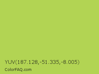 YUV 187.128,-51.335,-8.005 Color is a normal lime color and the nearest color is Conifer #acdd4d. Hex code #b2d453 and RGB value is rgb(178,212,83). In RGB color space, this color is composed of 70% red, 83% green, 33% blue, In CMYK color space, this color is composed of 16% cyan, 0% magenta, 61% yellow , 17% black , In HSL color space, this color has a hue angle of 76° , 60% saturation and 58% lightness.