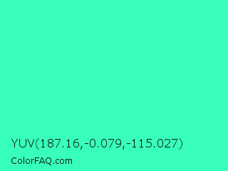 YUV 187.16,-0.079,-115.027 Color is a light green color and the nearest color is Turquoise #40e0d0. Hex code #38febb and RGB value is rgb(56,254,187). In RGB color space, this color is composed of 22% red, 100% green, 73% blue, In CMYK color space, this color is composed of 78% cyan, 0% magenta, 26% yellow , 0% black , In HSL color space, this color has a hue angle of 160° , 99% saturation and 61% lightness.