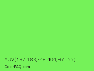 YUV 187.183,-48.404,-61.55 Color is a light green color and the nearest color is Screamin Green #66ff66. Hex code #75f259 and RGB value is rgb(117,242,89). In RGB color space, this color is composed of 46% red, 95% green, 35% blue, In CMYK color space, this color is composed of 52% cyan, 0% magenta, 63% yellow , 5% black , In HSL color space, this color has a hue angle of 109° , 85% saturation and 65% lightness.