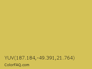 YUV 187.184,-49.391,21.764 Color is a normal yellow color and the nearest color is Tacha #d6c562. Hex code #d4c257 and RGB value is rgb(212,194,87). In RGB color space, this color is composed of 83% red, 76% green, 34% blue, In CMYK color space, this color is composed of 0% cyan, 8% magenta, 59% yellow , 17% black , In HSL color space, this color has a hue angle of 51° , 59% saturation and 59% lightness.