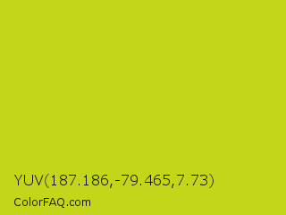 YUV 187.186,-79.465,7.73 Color is a normal yellow color and the nearest color is Key Lime Pie #bfc921. Hex code #c4d61a and RGB value is rgb(196,214,26). In RGB color space, this color is composed of 77% red, 84% green, 10% blue, In CMYK color space, this color is composed of 8% cyan, 0% magenta, 88% yellow , 16% black , In HSL color space, this color has a hue angle of 66° , 78% saturation and 47% lightness.
