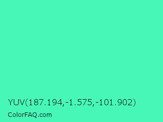 YUV 187.194,-1.575,-101.902 Color is a light green color and the nearest color is Turquoise #40e0d0. Hex code #47f7b8 and RGB value is rgb(71,247,184). In RGB color space, this color is composed of 28% red, 97% green, 72% blue, In CMYK color space, this color is composed of 71% cyan, 0% magenta, 26% yellow , 3% black , In HSL color space, this color has a hue angle of 159° , 92% saturation and 62% lightness.