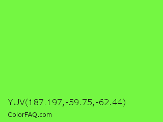 YUV 187.197,-59.75,-62.44 Color is a light green color and the nearest color is Spring Frost #87ff2a. Hex code #74f742 and RGB value is rgb(116,247,66). In RGB color space, this color is composed of 45% red, 97% green, 26% blue, In CMYK color space, this color is composed of 53% cyan, 0% magenta, 73% yellow , 3% black , In HSL color space, this color has a hue angle of 103° , 92% saturation and 61% lightness.