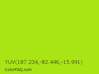 YUV 187.234,-82.446,-15.991 Color is a normal lime color and the nearest color is Inch Worm #b0e313. Hex code #a9e514 and RGB value is rgb(169,229,20). In RGB color space, this color is composed of 66% red, 90% green, 8% blue, In CMYK color space, this color is composed of 26% cyan, 0% magenta, 91% yellow , 10% black , In HSL color space, this color has a hue angle of 77° , 84% saturation and 49% lightness.