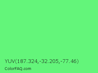 YUV 187.324,-32.205,-77.46 Color is a light green color and the nearest color is Very Light Malachite Green #64e986. Hex code #63f57a and RGB value is rgb(99,245,122). In RGB color space, this color is composed of 39% red, 96% green, 48% blue, In CMYK color space, this color is composed of 60% cyan, 0% magenta, 50% yellow , 4% black , In HSL color space, this color has a hue angle of 129° , 88% saturation and 67% lightness.