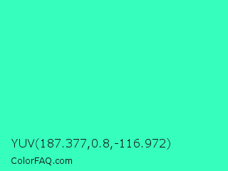 YUV 187.377,0.8,-116.972 Color is a light green color and the nearest color is Turquoise #40e0d0. Hex code #36ffbd and RGB value is rgb(54,255,189). In RGB color space, this color is composed of 21% red, 100% green, 74% blue, In CMYK color space, this color is composed of 79% cyan, 0% magenta, 26% yellow , 0% black , In HSL color space, this color has a hue angle of 160° , 100% saturation and 61% lightness.