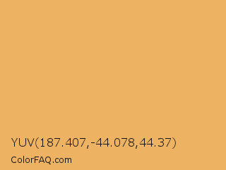 YUV 187.407,-44.078,44.37 Color is a light orange color and the nearest color is Porsche #eaae69. Hex code #eeb362 and RGB value is rgb(238,179,98). In RGB color space, this color is composed of 93% red, 70% green, 38% blue, In CMYK color space, this color is composed of 0% cyan, 25% magenta, 59% yellow , 7% black , In HSL color space, this color has a hue angle of 35° , 80% saturation and 66% lightness.